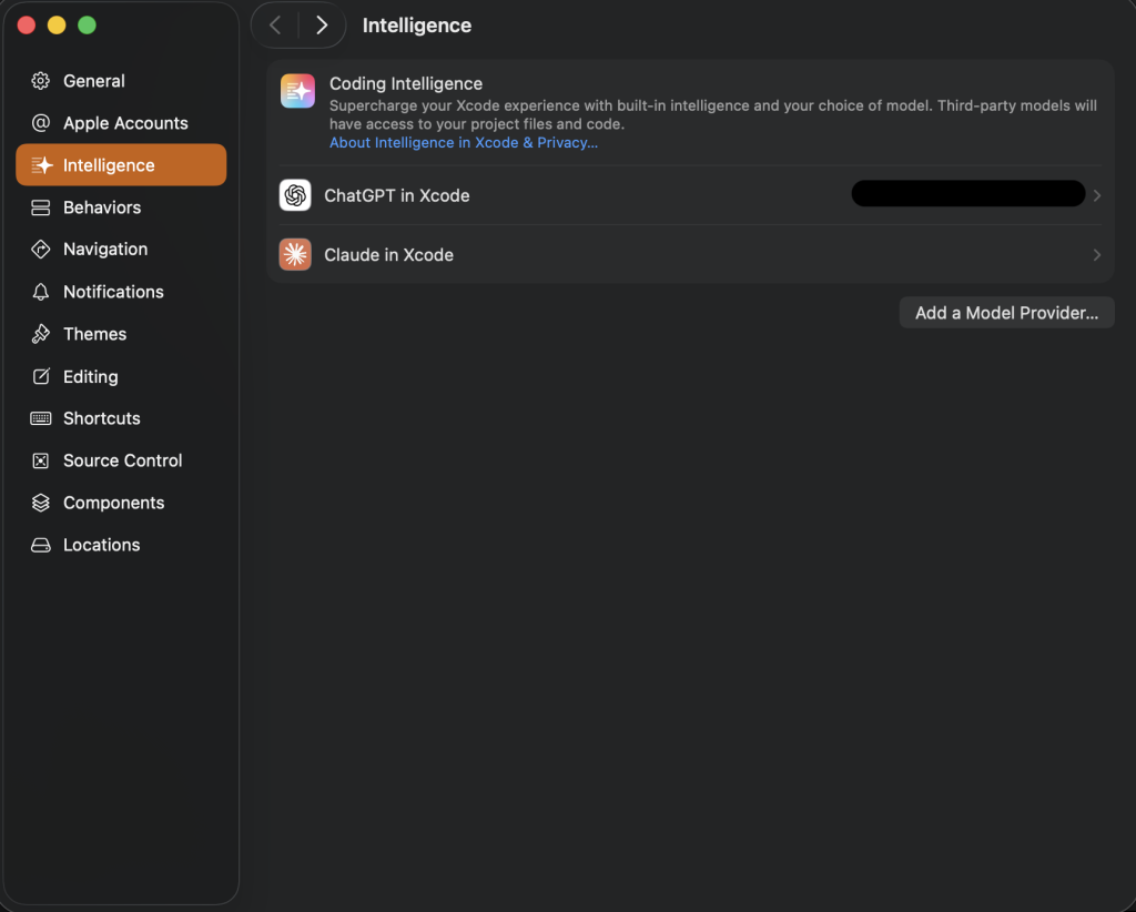在左側選單上可以看到 Intelligence 的選項,Xcode 內建 ChatGPT 與 Claude ,只要點下去登入就可以了,ChatGPT 免費帳號就可以使用,但 Claude 必須要是付費帳號才可以使用 。