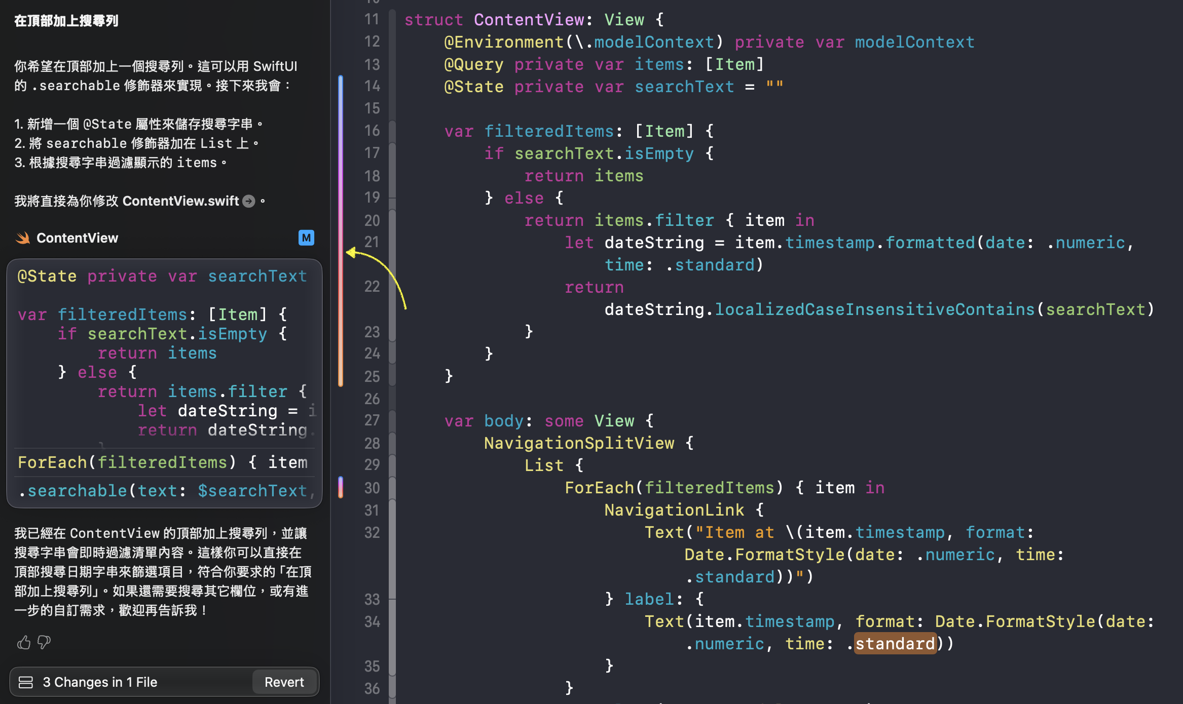 在範例圖中,我下了「在頂部加上搜尋列」,它就會自動幫我修改程式,會先告訴你會怎麼調整,然後就會直接調整了。