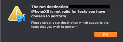 在跑 UI Test時候出現了一個警示,是說 iPhone XS 無法執行Tests,當下只是覺得奇怪明明前一陣子都跑的好好的,怎麼現在不行了