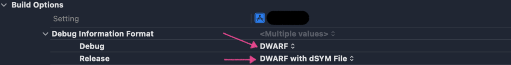 再來一樣是在 Build setting 底下搜尋 Debug information format,展開可以看到 DWARF / DWARF with dSYM file,DWARF 全名是 Debugging With Arbitrary Record Formats,簡單來說就是一般的Debug file ,DWARF with dSYM 就是一般的Debug file 再加上 debug symbol。